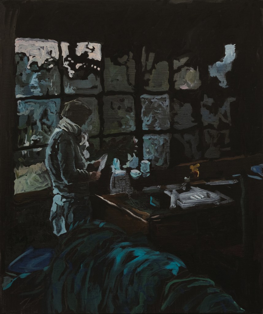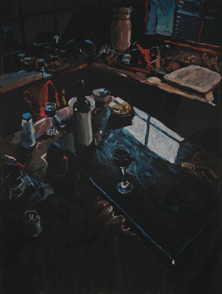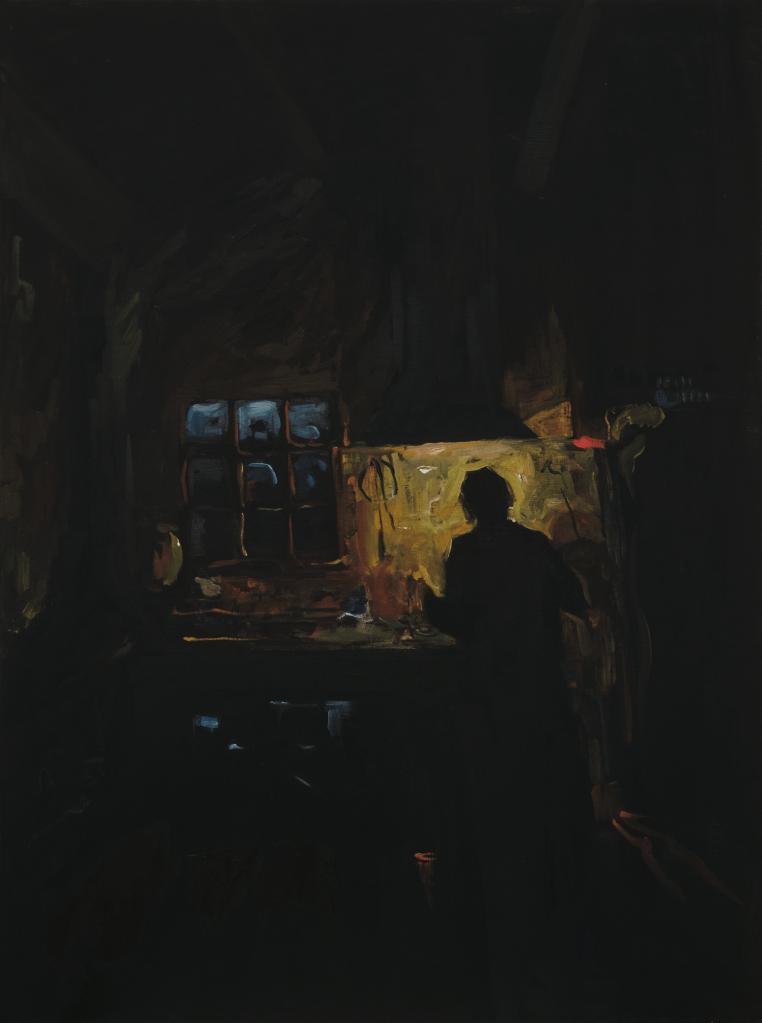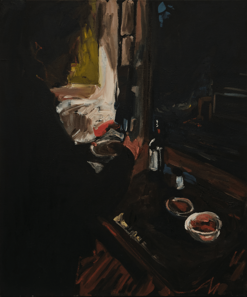 Fear not the harsh winter is a series of paintings about my experience of darkness over the winter solstice, while on a residency with my mum in Glaziers Bay, Tasmania. These works observe the enveloping advance of night through interiors, exteriors, and in between spaces. Using expressive marks and moments of colour on a black ground, I show darkness as a space rich with possibility, forming a threshold between real and unreal, conversation and silence, disconnection and communion. The shifting silhouette of my mother has become the main character, moving from space to space, forming around her the keys to surviving a winter.