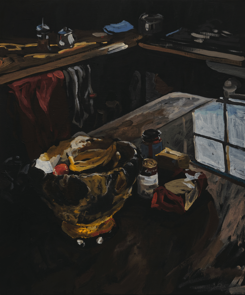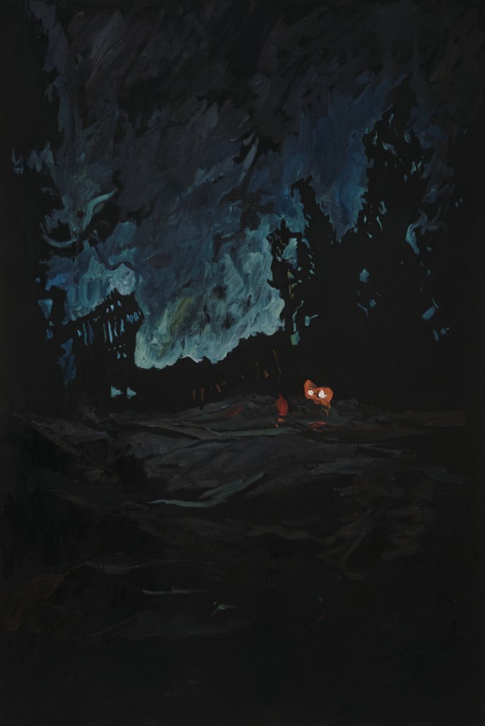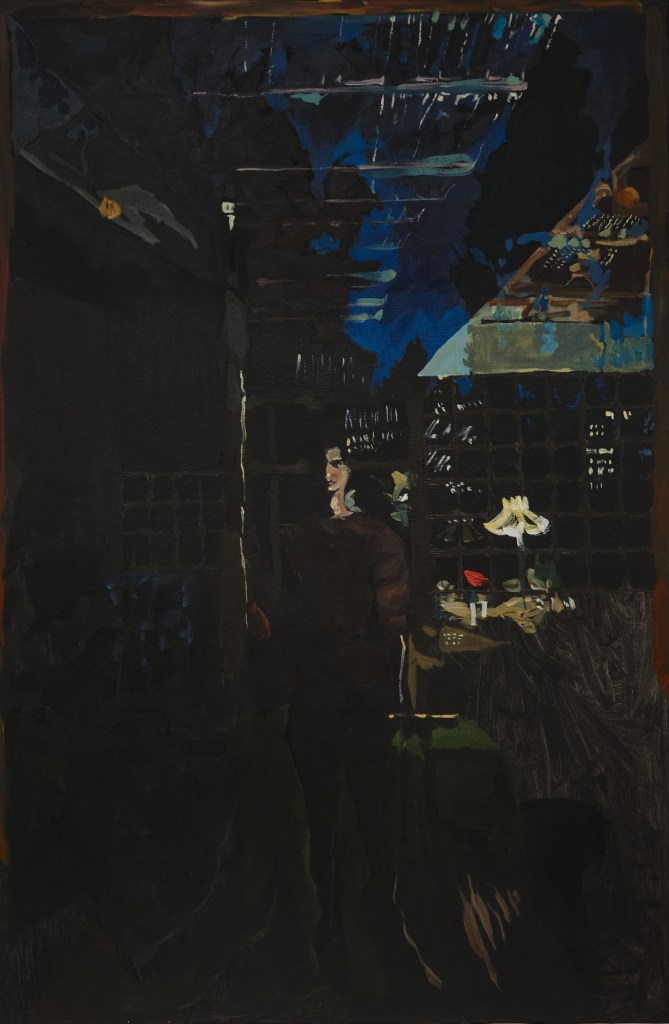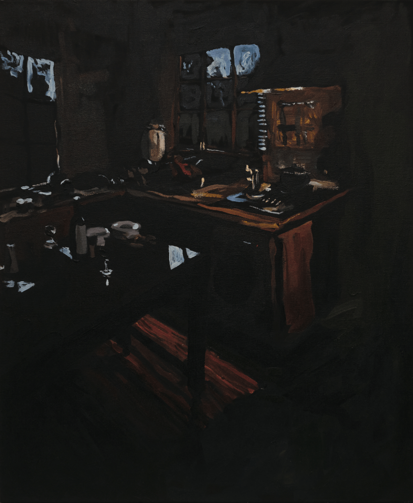Fear not the harsh winter is a series of paintings about my experience of darkness over the winter solstice, while on a residency with my mum in Glaziers Bay, Tasmania. These works observe the enveloping advance of night through interiors, exteriors, and in between spaces. Using expressive marks and moments of colour on a black ground, I show darkness as a space rich with possibility, forming a threshold between real and unreal, conversation and silence, disconnection and communion. The shifting silhouette of my mother has become the main character, moving from space to space, forming around her the keys to surviving a winter.